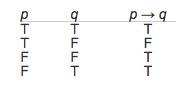 Como puede ver p → q resulta falso solamente cuando la cláusula antecedente es verdadera y la cláusula consecuente es falsa. (Yo sé que parece extraño, pero esa es la manera que “→” se entiende de forma lógica.)